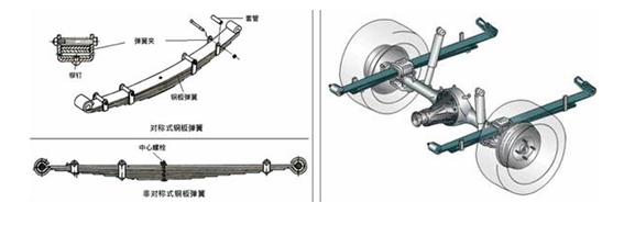 →長方形、彎曲形、數(shù)片合金彈簧片疊加、能伸縮、等寬不等長(厚度可以相等,也可以不相等)、汽車底盤用,一端以梢子安裝在吊架上,另一端使用吊耳連接到大梁上。
